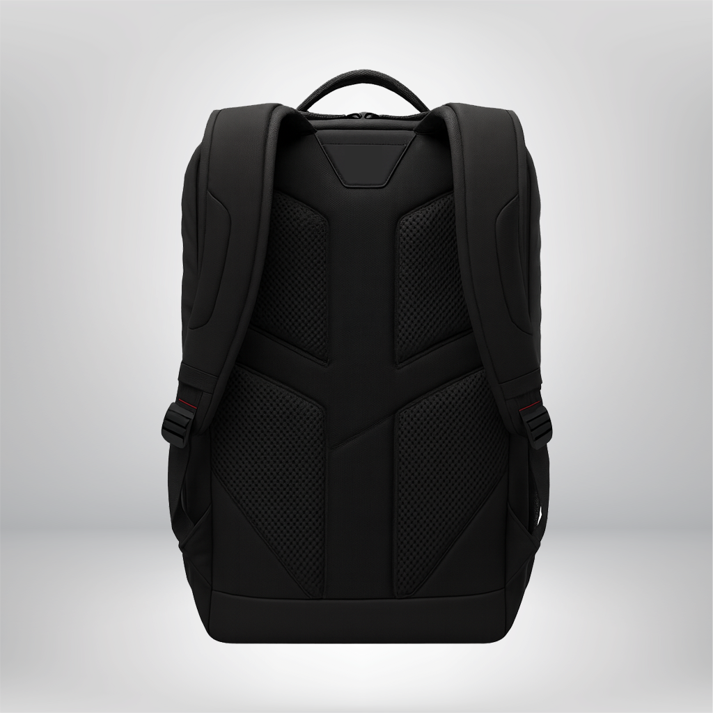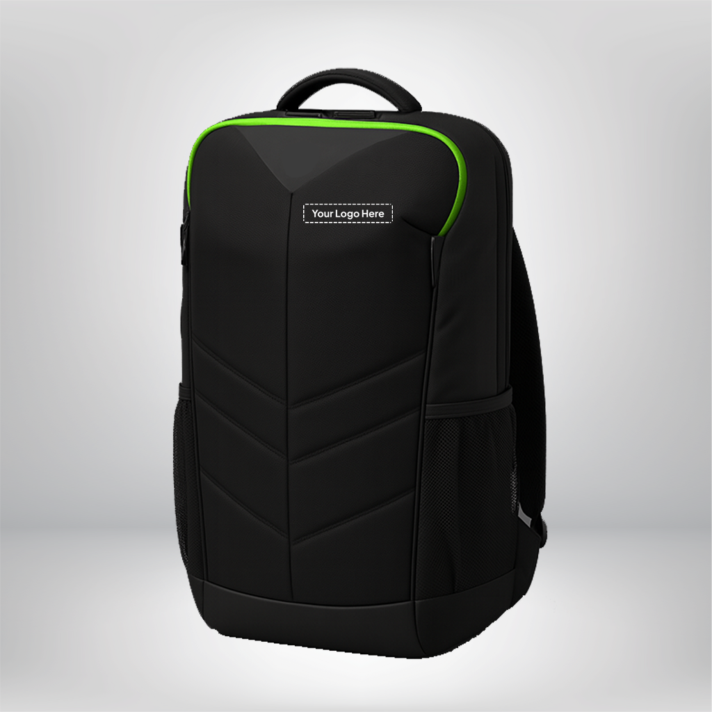 • Modern black backpack with vibrant green detailing